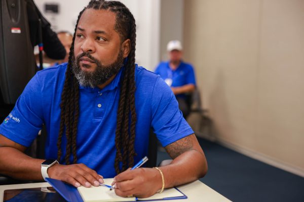 Rob attending a morning team meeting at the Sales Office, where leaders share new tools and expectations to set the tone for the week.